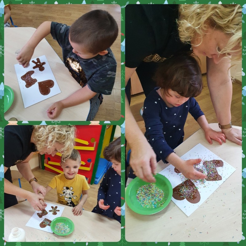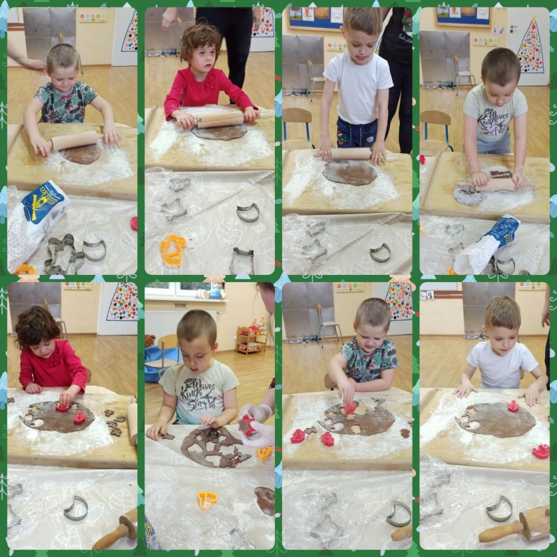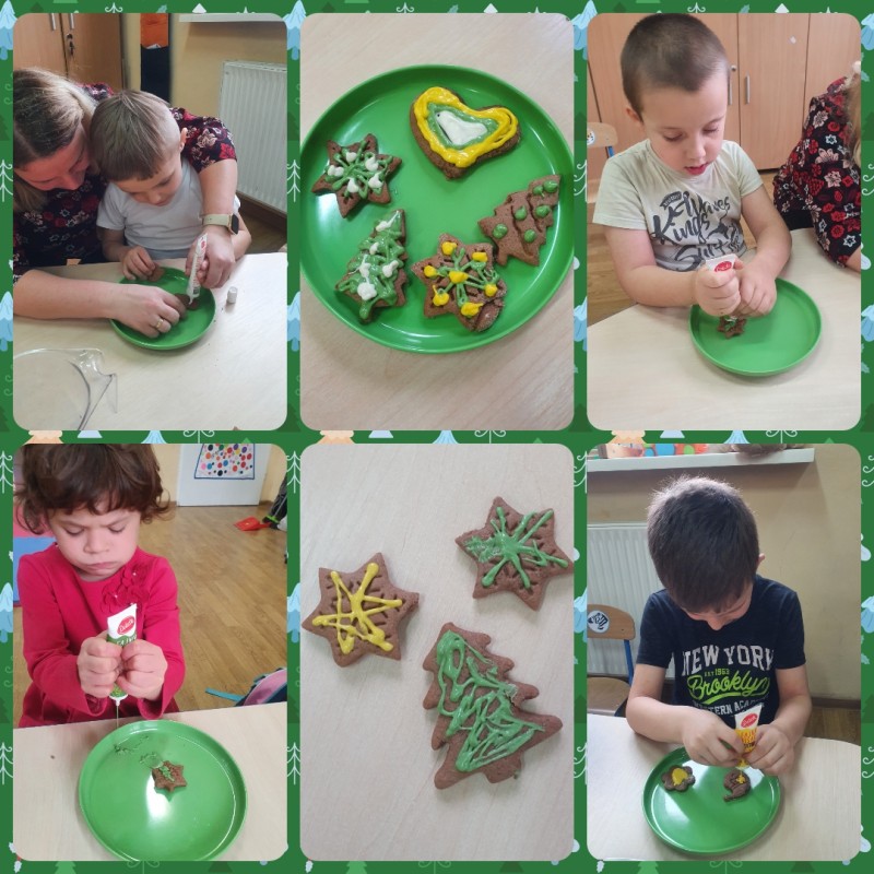 Zbliża się magiczny czas Świąt Bożego Narodzenia. W ostatnich dniach w przedszkolu, za sprawą wielu przygotowań, zapanowała prawdziwie świąteczna atmosfera. Przedszkolaki miały okazję poznać składniki oraz proces przygotowania ciasta piernikowego, jednak najwięcej radości sprawiło im wycinanie foremkami różnych kształtów. Gotowe pierniczki zostały polukrowane i twórczo udekorowane. Nie zabrakło również pięknych ozdób i dekoracji oraz świątecznych zabaw.
