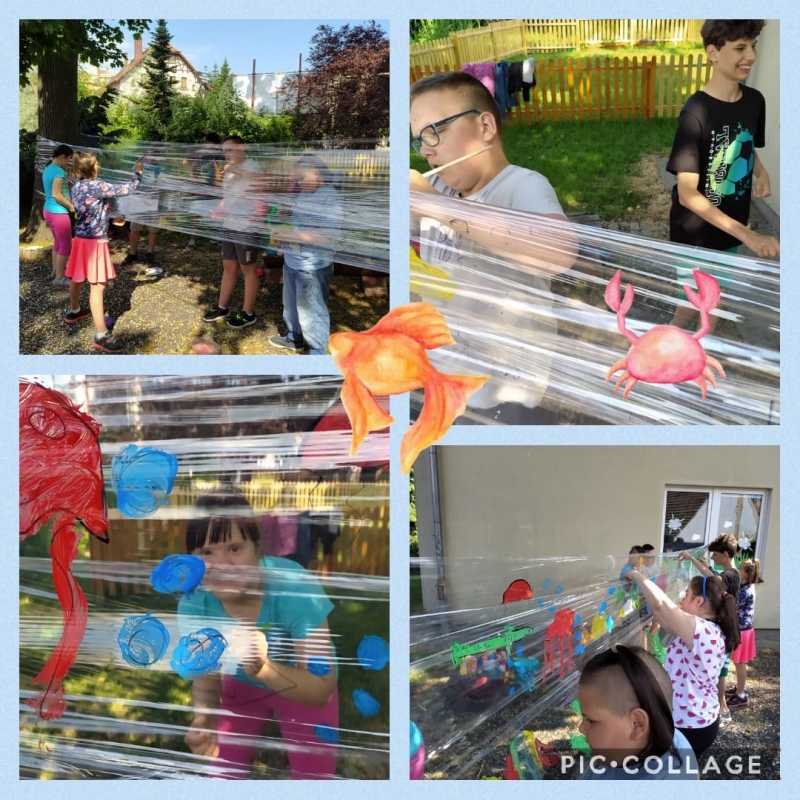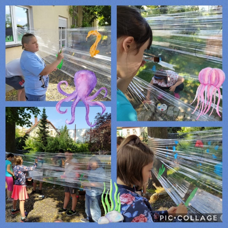 Zbliżają się wakacje! Jeszcze tylko 15 dni szkolnych, więc temat mórz i oceanów jest nam bardzo bliski. Dlatego po obejrzeniu filmików edukacyjno- przyrodniczych o podwodnym świecie, uczniowie klas 4-8a przenieśli się na podwórko, by stworzyć niepowtarzalny morski klimat, na folii rozciągniętej pomiędzy drzewami.