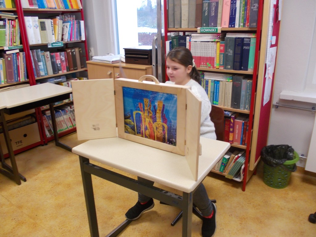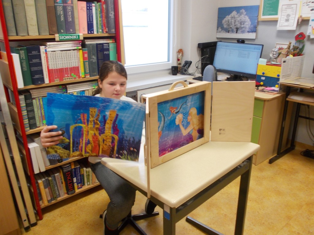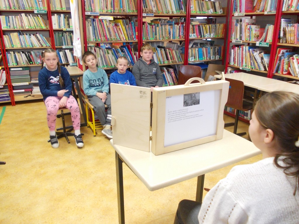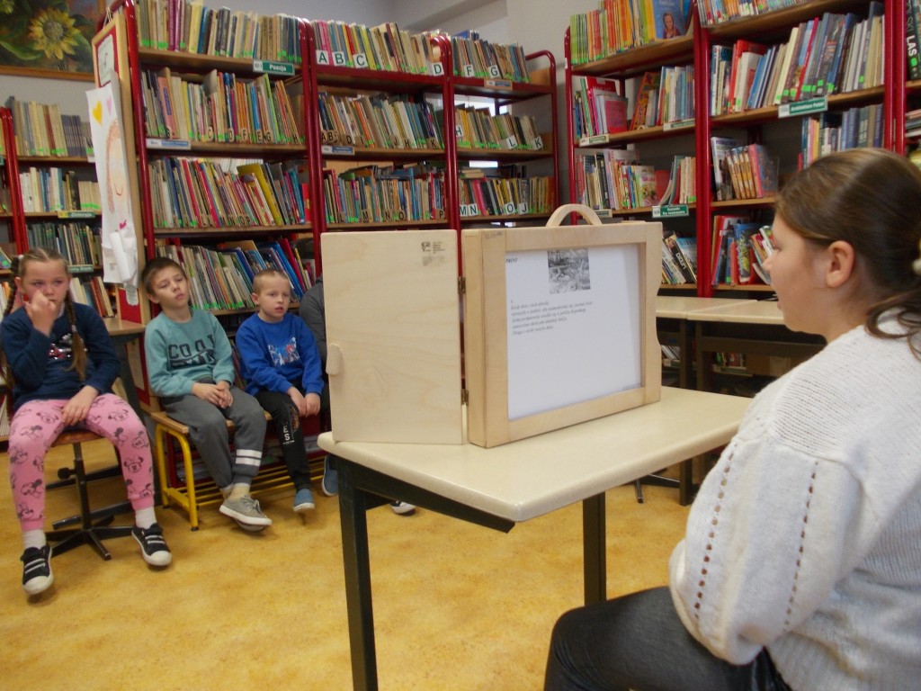 Przez cały pierwszy semestr uczniowie klasy 1-3 b szkoły podstawowej uczestniczyli w spotkaniach z literaturą, w bibliotece szkolnej. W każdy czwartek brali udział w Podróżach z bajką. Dzieci poznawały beletrystykę, zakupioną w ramach NPRC, prezentowaną również w formie teatrzyku Kamishibai. Atrakcyjna forma prezentowania opowiadań, legend, baśni, wypożyczanych również z innych bibliotek, sprzyjała zabawie w miłej atmosferze. Na szczególne wyróżnienie zasługuje Milenka, uczennica klasy 3, która wielokrotnie prowadziła zajęcia. Pięknie czytała i przedstawiała swoim kolegom i koleżankom bajki. Milenka również była zapraszana do klas starszych, którym również prezentowała swoje wysokie umiejętności czytelnicze. Wyjaśniała też innym, co trzeba robić, żeby pięknie czytać. Tylko systematyczne ćwiczenia przynoszą oczekiwane efekty. Jak to mówią: „Praktyka czyni Mistrza”.