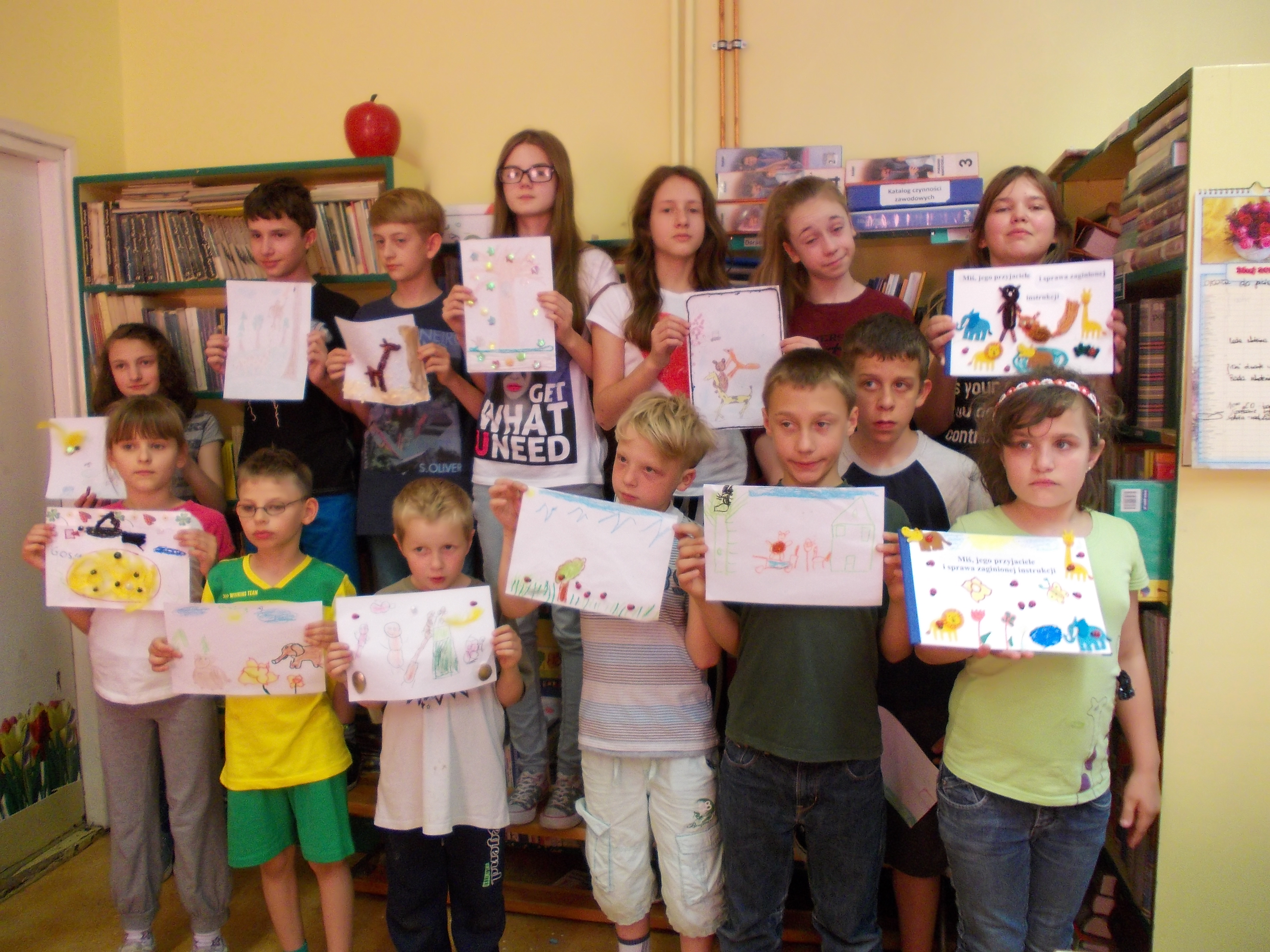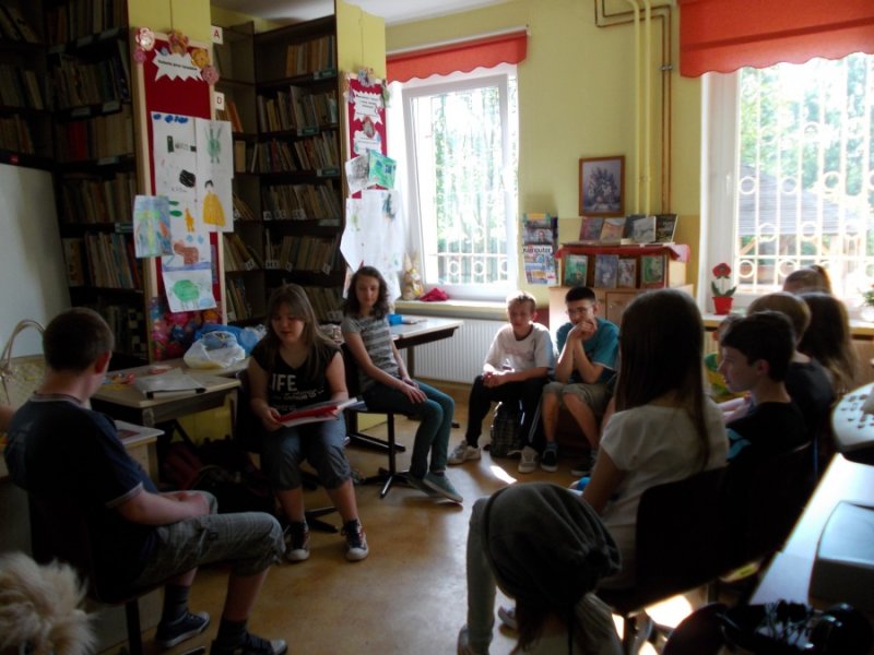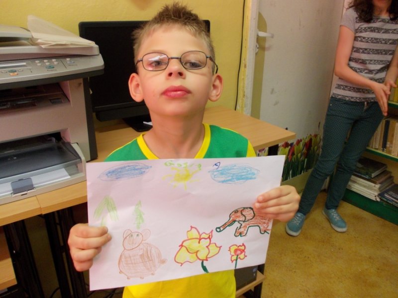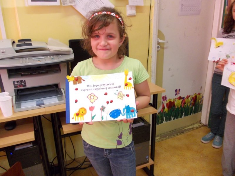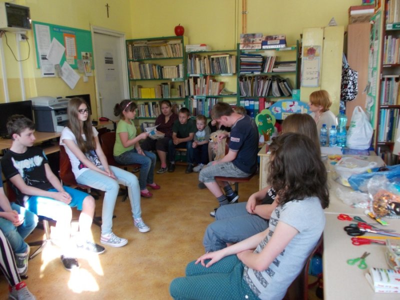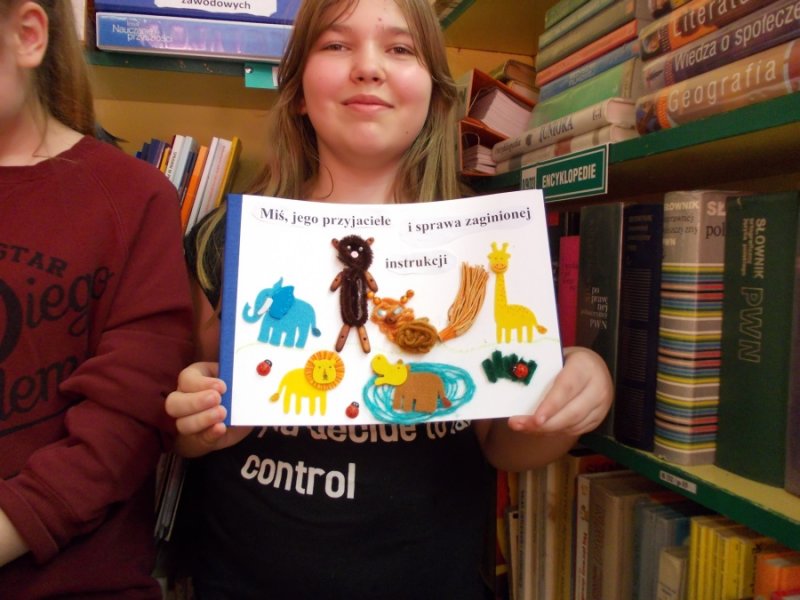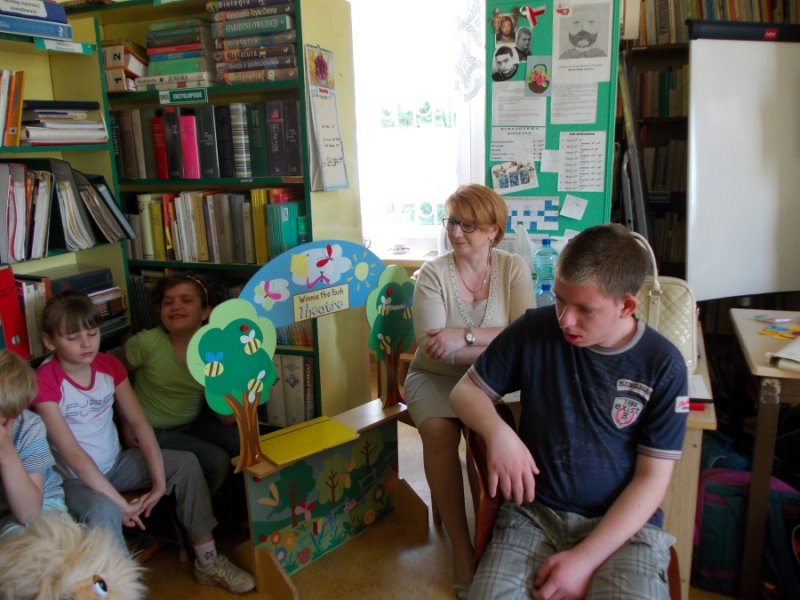 Wczoraj w bibliotece szkolnej odbyło się spotkanie integracyjne pt. „Literackie fantazje”. W zabawie wzięli udział uczniowie klasy I-III z naszego Ośrodka i uczniowie klasy VI ze Szkoły Podstawowej nr 1 w Złotoryi. Celem spotkania było wspólne napisanie i zilustrowanie bajeczki dla dzieci. Uczniowie obu szkół szybko nawiązali ze sobą kontakt.Goście mieli okazję posłuchać bajeczek napisanych i zilustrowanych wcześniej przez naszych uczniów. Bajeczki czytały dwie dziewczynki: Małgosia i Klaudia , które zrobiły to przepięknie i na pewno swoimi umiejętnościami zadziwiły naszych gości. Szóstoklasiści zapoznali się również z twórczością literacką naszych wychowanków, którzy systematycznie od trzech lat tworzą własne opowiadania i bajeczki. Przelewają w ten sposób na papier swoje literackie fantazje. Często też piszą i mówią o swoich pragnieniach, o codziennym życiu, radościach i smutkach, ale również zaglądają w przyszłość, kreują ją. Opowiadają o tym, co będą robić, kiedy dorosną.Goście po zapoznaniu się z „dorobkiem” literackim naszych wychowanków nie mieli problemu ze wspólnym tworzeniem nowej opowiastki. Gracjan, uczeń z SP nr 1 przejął rolę pisarza, który notował wszystko to, co mówią inni i bardzo umiejętnie układał zdania w spójną, logiczną i piękną całość. Wiktoria, jego koleżanka z klasy była bardzo aktywna, wymyśliła tytuł bajki i miała ciekawe pomysły. Pozostali uczniowie również bardzo ładnie pracowali. Spotkanie zakończyło się napisaniem bajeczki pt. „Miś, jego przyjaciele i sprawa zaginionej instrukcji”, która zawiera pierwiastki dobra i zła ( bo tym powinna charakteryzować się opowiastka dla najmłodszych). Głównym jej przesłaniem jest przyjaźń i niesienie sobie pomocy w trudnych sytuacjach, oraz przestroga przed czynieniem zła, które nigdy nie popłaca. Ilustracje wykonywane były różnorodnymi materiałami plastycznymi, dlatego też są niezwykle ciekawe i piękne. Każda szkoła na pamiątkę dostała egzemplarz własnoręcznie wykonanej książeczki.