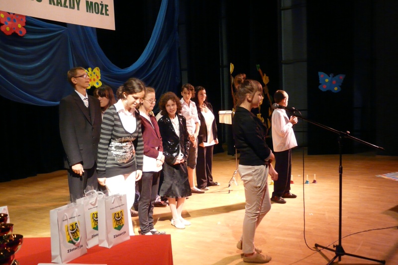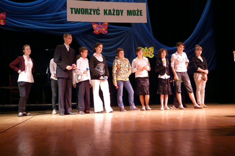 Dnia 20 czerwca uczestniczyliśmy w fajnej imprezie w Złotoryjskim Ośrodku Kultury i Rekreacji . Był to Przegląd Twórczości Artystycznej Osób Niepełnosprawnych pod hasłem „Tworzyć każdy może”. Imprezę po raz pierwszy zorganizował Dom Pomocy Społecznej w Złotoryi dla Ośrodków Szkolno-Wychowawczych, Klubu Seniora, Warsztatów Terapii Zajęciowej, Domów Pomocy Społecznej z najbliższej okolicy. Każda placówka przygotowała fantastyczny występ – były tańce, śpiewy, gra na instrumentach, teatr, recytacja wierszy.Przednio się bawiliśmy.Nasze prezentacje spodobały się publiczności – były gromkie brawa i pochwały za kurtyną. Uczestniczyliśmy również w przygotowanym na holu poczęstunku. Każdy zespół otrzymał na koniec wielką paczkę z prezentami dla uczestników, słodycze i puchar. Myślę, że spotkamy się znów w następnym roku szkolnym 🙂