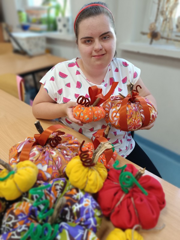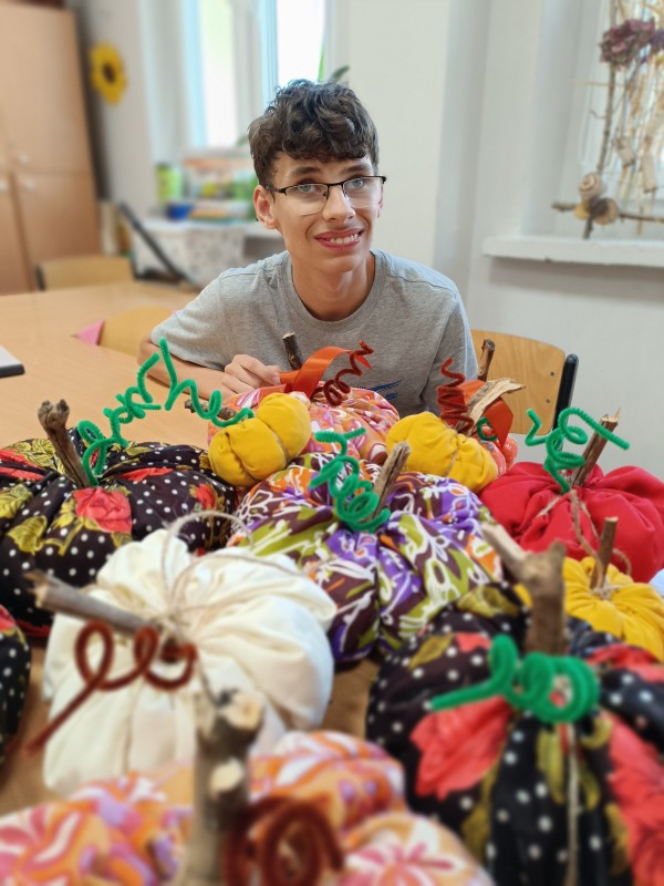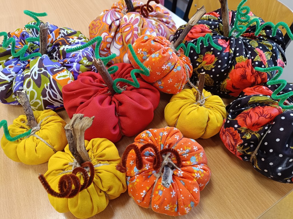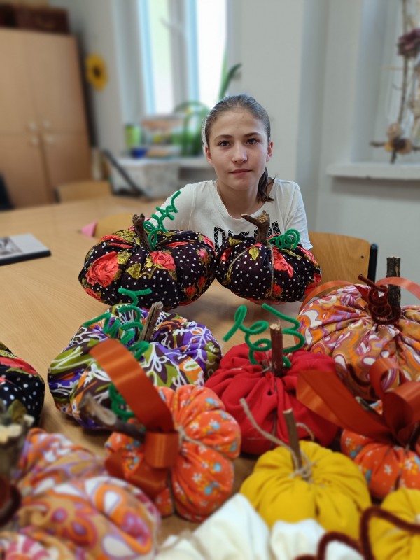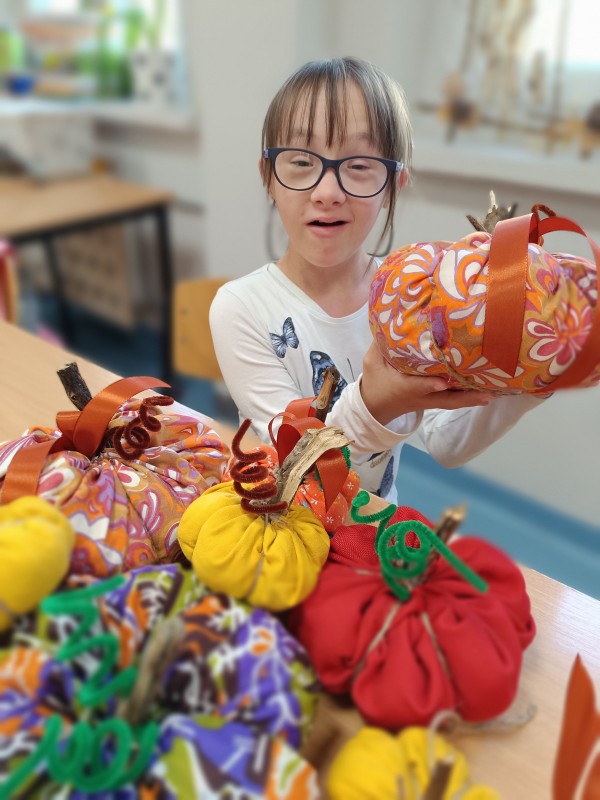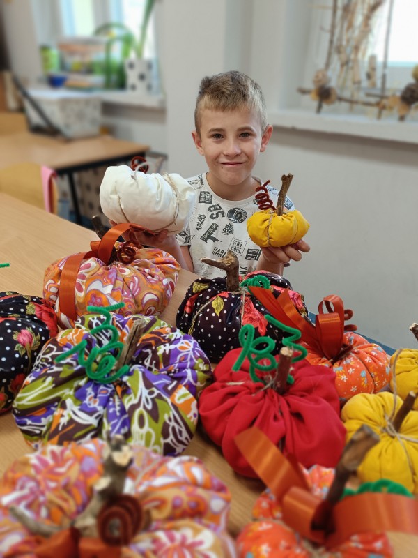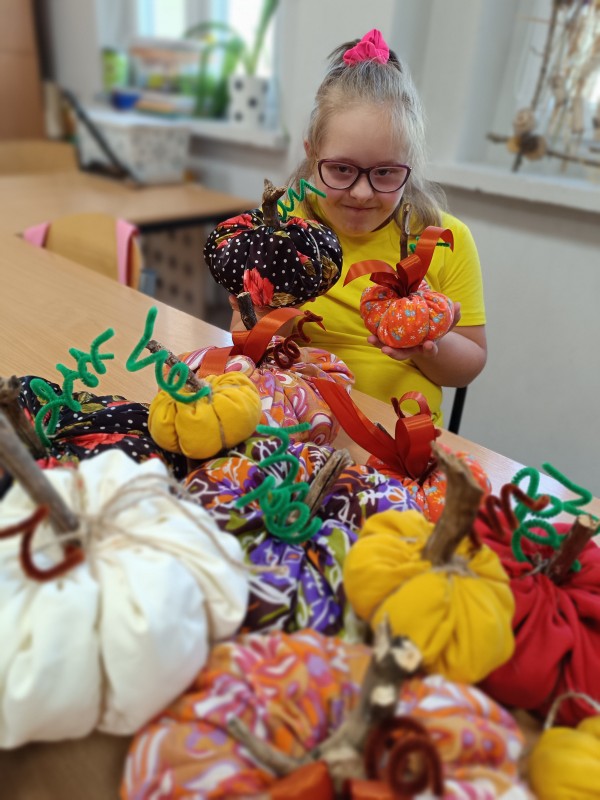 Klasa 5-8a zafascynowana ilością i kolorytem tysięcy dyń w Dyniowym zakątku, postanowiła sama udekorować klasę uszytymi własnoręcznie dyniami. Wszyscy wykazali się zręcznością w posługiwaniu igłą i nićmi. Tak powstała oryginalna dekoracja klasy. Brawa!