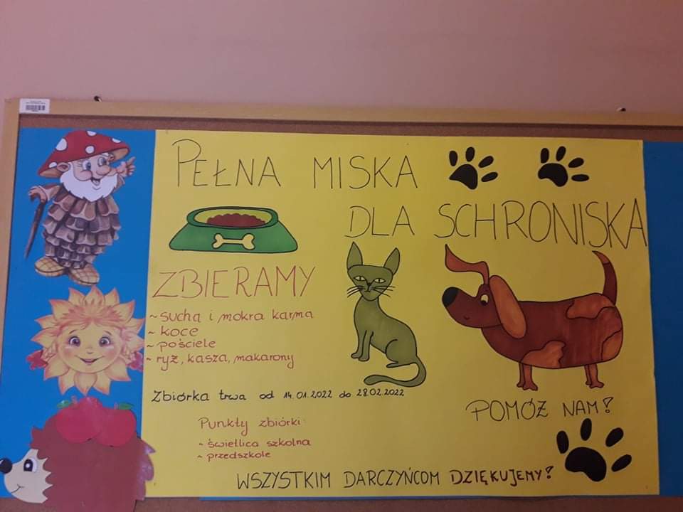 Zachęcamy Was do dzielenia się dobrem, a nasi futrzaści przyjaciele, zwierzęta ze schronisk, bezdomne i porzucone psy i koty potrzebują wsparcia. Od 17 stycznia rozpoczynamy zbiórkę karmy mokrej (puszki), suchej, kocy, zabawek, które można dostarczać do przedszkola. We wtorek i środę 18-19 stycznia będziemy również prosić Was, drodzy uczniowie i nauczyciele o wrzucenie drobnych kwot do naszej skarbonki na zakup karmy. Z całego serca dziękuję w imieniu naszych braci mniejszych.